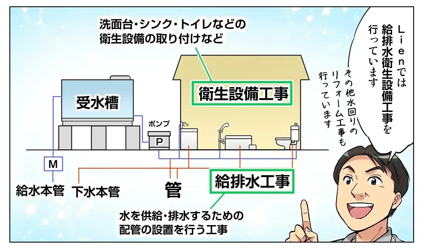市にあるLien株式会社は、給排水設備工事をメインに手掛ける会社です。会社概要とアクセスマップはこちらからご確認いただけます。