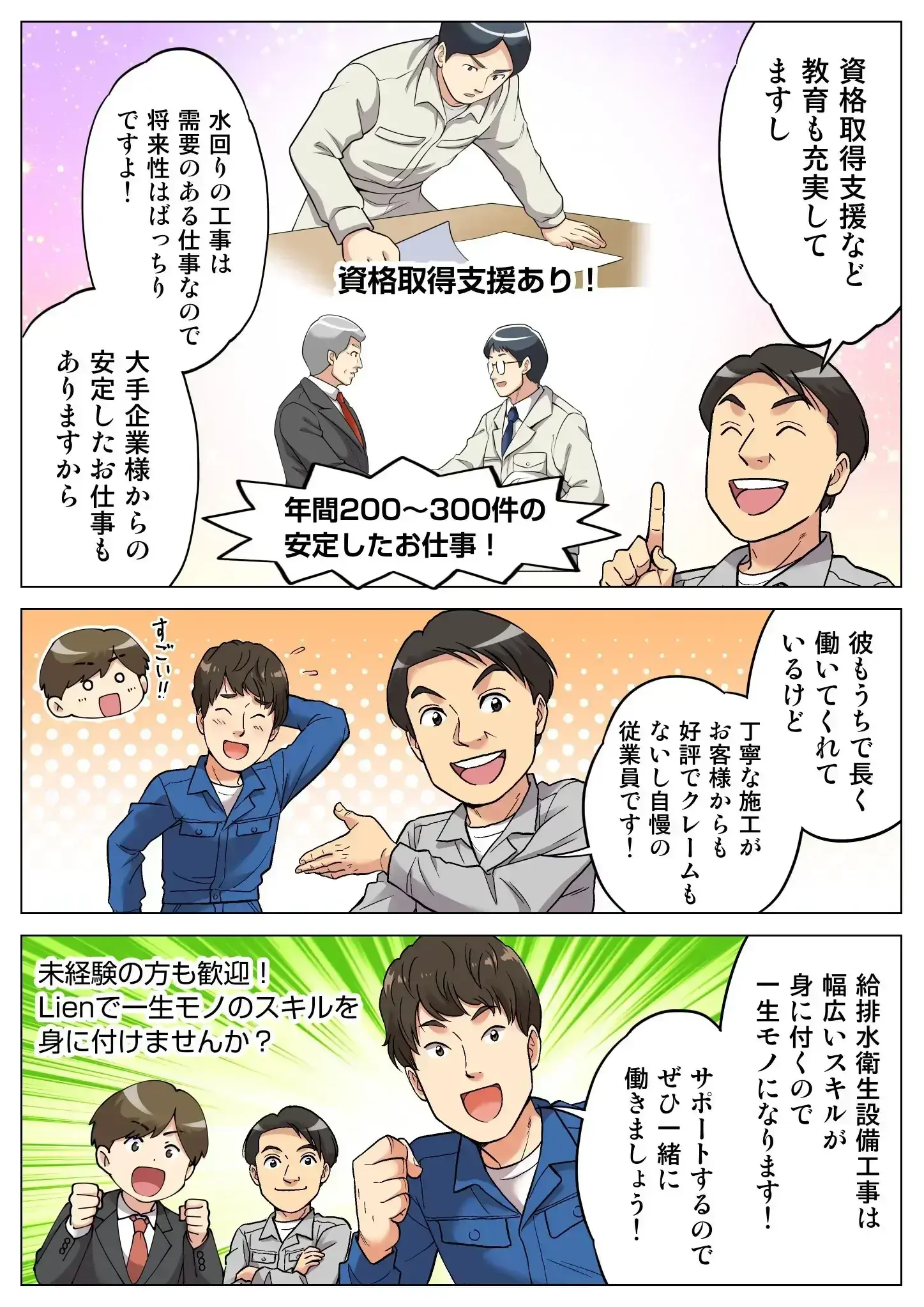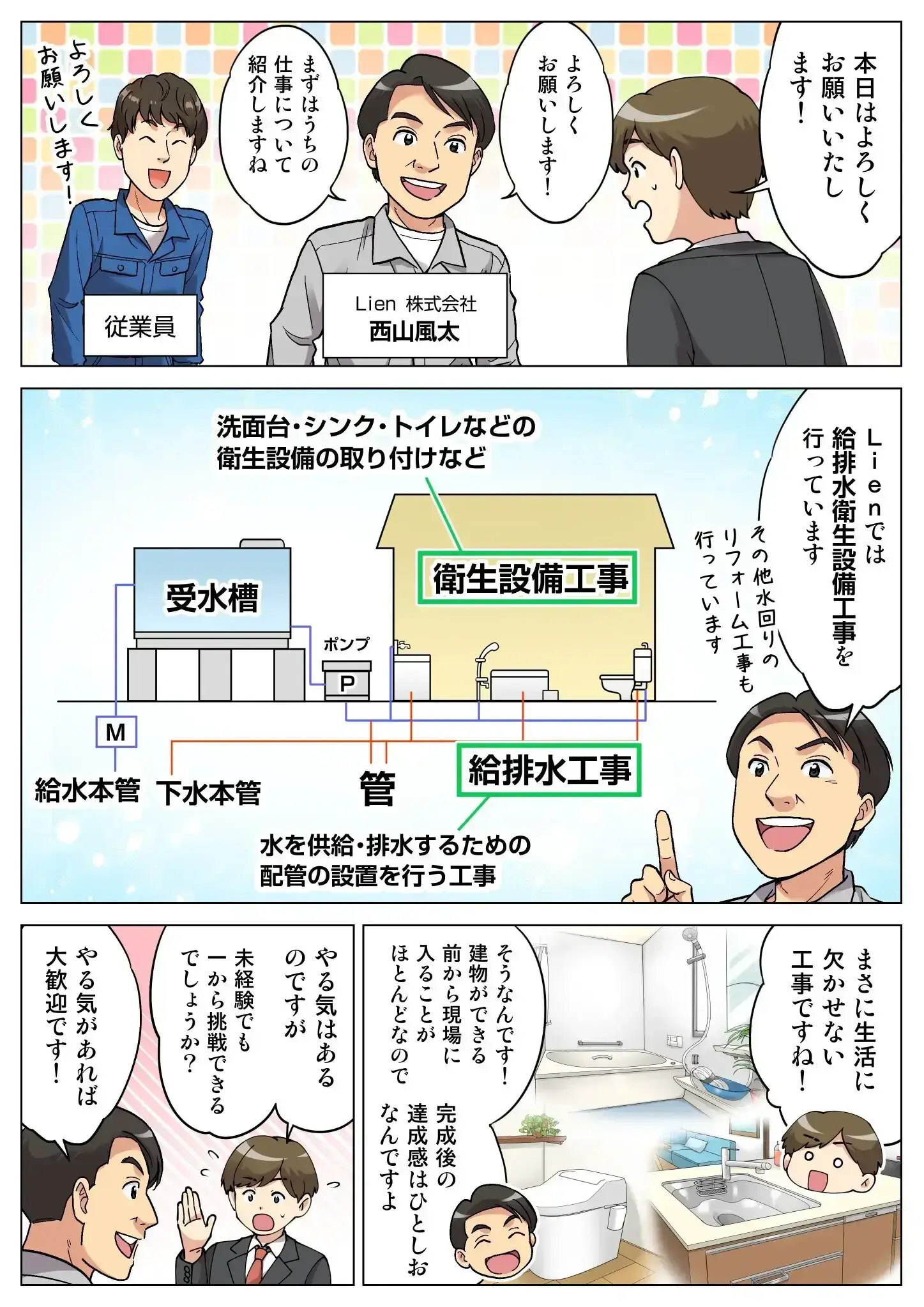 新築時の給排水設備工事だけでなく、水回りリフォームや改修工事なども手掛けていることから、給排水や水回り工事に関する幅広い一生モノのスキルが身に付きます。